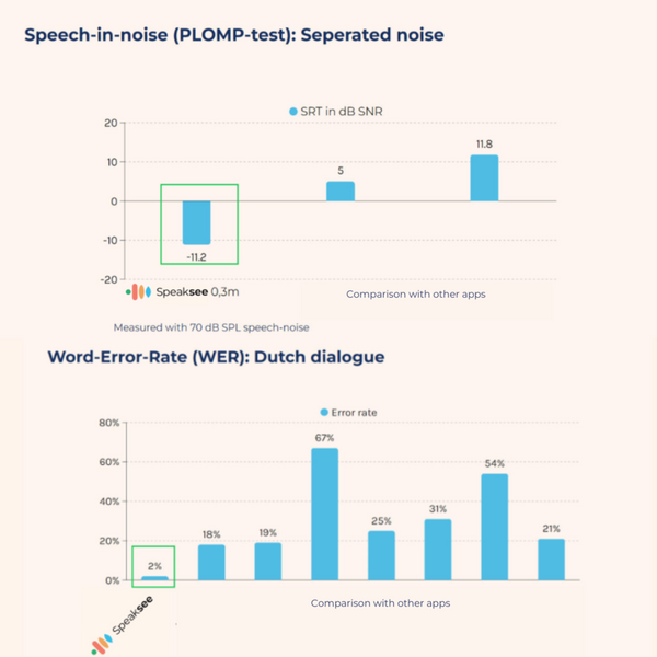 Begin 2023 heeft er in het RadboudUMC een vergelijkend onderzoek met Speaksee plaatsgevonden. Hieruit bleek dat Speaksee de hoogte nauwkeurigheid in transcriptie heeft vergeleken alternatieve apps en dat Speaksee het beste werkt in achtergrondlawaai.